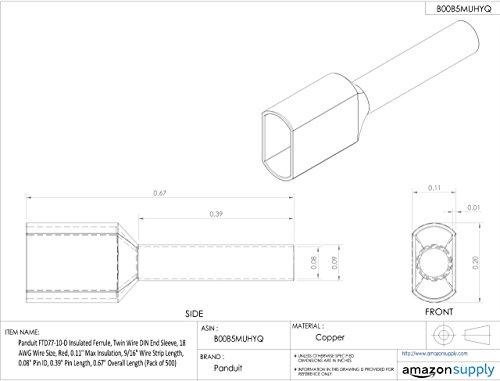 Panduit FTD77-10-D Insulated Ferrule, Twin Wire DIN End Sleeve, 18 AWG Wire Size, Red, 0.11" Max Insulation, 9/16" Wire Strip Length, 0.08" Pin ID, 0.39" Pin Length, 0.67" Overall Length (Pack of 500) [並行輸入品]