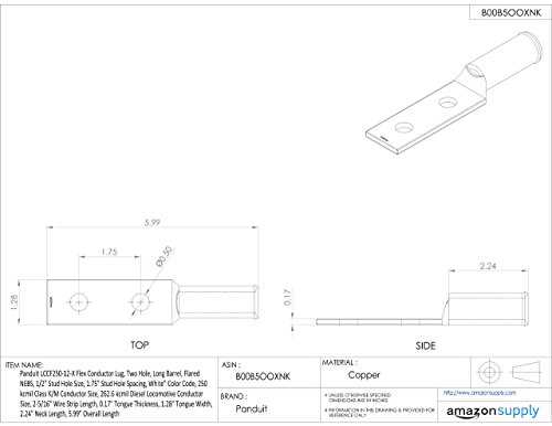 Panduit LCCF250-12-X Flex Conductor Lug, Two Hole, Long Barrel, Flared NEBS, 1/2" Stud Hole Size, 1.75" Stud Hole Spacing, White" Color Code, 250 kcmil Class K/M Conductor Size, 262.6 kcmil Diesel Locomotive Conductor Size, 2-5/16" Wire Strip Length, 0.17" Tongue Thickness, 1.28" Tongue Width, 2.24" Neck Length, 5.99" Overall Length [並行輸入品]
