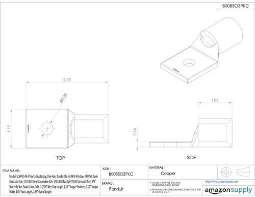 Panduit LCAX4/0-38-X Flex Conductor Lug, One Hole, Standard Barrel With Window, 4/0 AWG Code Conductor Size, 4/0 AWG Diesel Locomotive Size, 4/0 AWG Class G/H/I/K/M Conductor Size, 3/8" Stud Hole Size, Purple Color Code, 1-1/16" Wire Strip Length, 0.16" Tongue Thickness, 1.19" Tongue Width, 1.03" Neck Length, 2.53" Overall Length [並行輸入品]