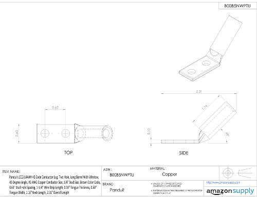 Panduit LCC2-14AWH-Q Code Conductor Lug, Two Hole, Long Barrel With Window, 45 Degree Angle, #2 AWG Copper Conductor Size, 1/4" Stud Size, Brown Color Code, 0.63" Stud Hole Spacing, 1-1/4" Wire Strip Length, 0.10" Tongue Thickness, 0.60" Tongue Width, 1.16" Neck Length, 2.31" Overall Length [並行輸入品]