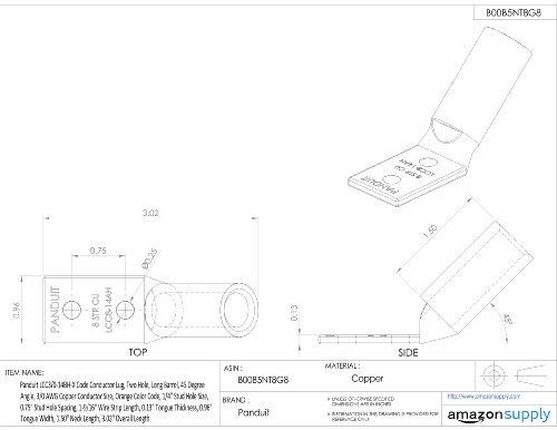 Panduit LCC3/0-14BH-X Code Conductor Lug, Two Hole, Long Barrel, 45 Degree Angle, 3/0 AWG Copper Conductor Size, Orange Color Code, 1/4" Stud Hole Size, 0.75" Stud Hole Spacing, 1-9/16" Wire Strip Length, 0.13" Tongue Thickness, 0.96" Tongue Width, 1.50" Neck Length, 3.02" Overall Length [並行輸入品]