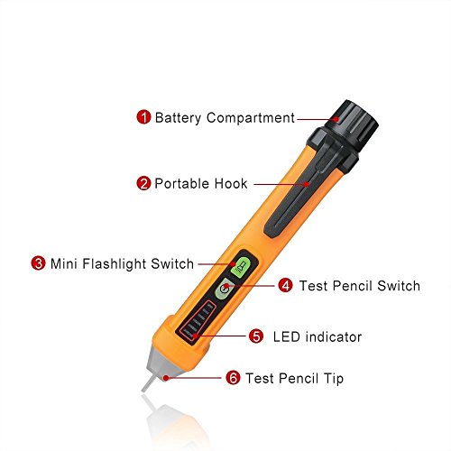 - ▲非接触:対象物に触れずに先端のLED点滅とビープ音で通電が迅速に確認できます。AC電圧は12~1000Vの間で使用が可能です。強さによってLED点滅も警告音も3レベル(低・中・高)があります。
