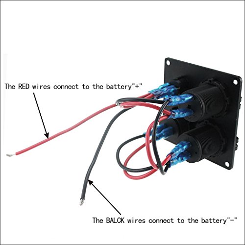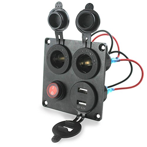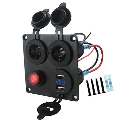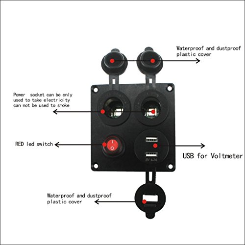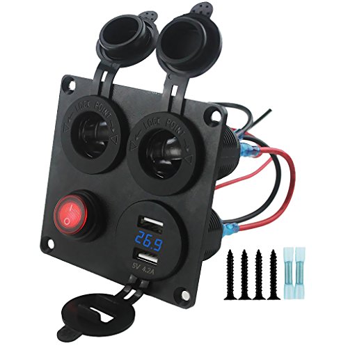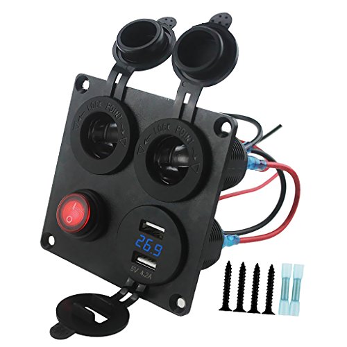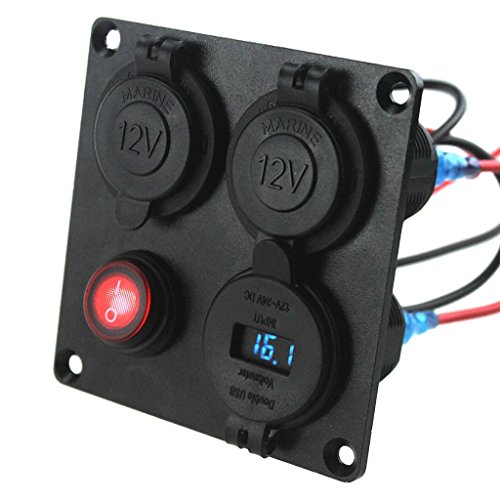 - この4穴パネルには、2つのUSB充電器ソケット(出力:DC 5V / 2.1A)+電圧計+ 12V電源コンセント(出力:DC 12V)+ ON-OFFトグルスイッチがあります。