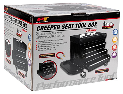 パフォーマンスツールクリーパーシートツールボックスを使えば作業がぐんと楽になります。-作業を始めようと座ってから、間違ったツールを手にしてしまっていることをに気づくことはありませんか?もし座っている場所自体がツールボックスだったら全く問題ありません。そんな時、活躍するのがPerformance Tool クリーパーシートツールボックスです。4個のポリ塩化ビニルにロールキャスター付きで快適な、パッド入りシートがあります。3つの引き出しにはたくさん工具を整理でき、手元に置いておくことができます。3分ごと新しいツールを取りに立つ必要はありません。クリーパーシートツールボックスを使ってスマートに作業しましょう。どうぞお座りください:工具を整理する3つの引き出し;2つの折り畳みマグネットパーツトレイにパーツやなツールを置いても引き出しにアクセス可能;ビニールパッド入りシートクッションは快適でサポート良好;2.5インチポリ塩化ビニル式キャスターでスムーズな動き;背面トレにはドライバーやペンチを収納;補強シートは耐荷重350ポンドまでサポート。シート寸法:16×9インチ;引き出し寸法:各13.5×7.75×2.25インチ;全体のサイズ:26 3/8インチ×14 1/8インチ×16インチ;重量:27 1/2ポンド。是非本日お買い求めください。Performance Tool クリーパーシートツールボックス。