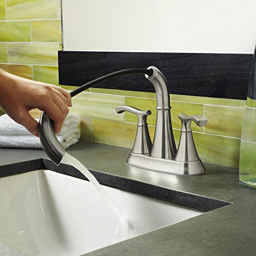 Push & sealTM drain requires no tools and installs in less than half the time of a standard pop-up drain, guaranteed tight seal each and every use - simply Press to seal and again to open. Ideal's graceful form and sleek handles add style and comfort to the bathroom, while its unique pull-out sprayer offers more functions than other bathroom faucets, such as rinsing the sink, cleaning-up after shaving, and washing hair. When not in use, the sprayer neatly retracts into the spout, maintaining ideal's elegant appearance. Ideal features the pfister exclusive push & seal drain for ease of installation and a tight seal every time.