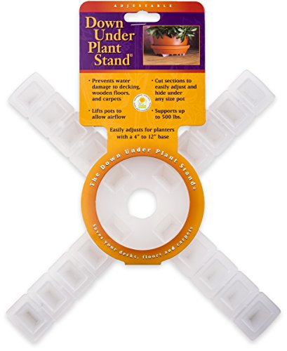 Prevents water damage to decking wooden floors and carpets Lifts pots to allow airflow Cut sections to easily adjust and hide under any size pot Supports up to 500 lbs Easily adjusts for planters with a 4" to 12" base Color of plant stand is Clear