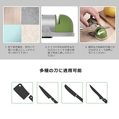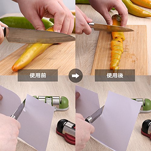 - 【2段階の研磨方法】: 包丁研ぎ器で刀を研ぎ、効果的に刃が鋭くなります。粗研ぎ、細研ぎの2つの方法で対応。さまざまな状態のナイフに便利に使えます。