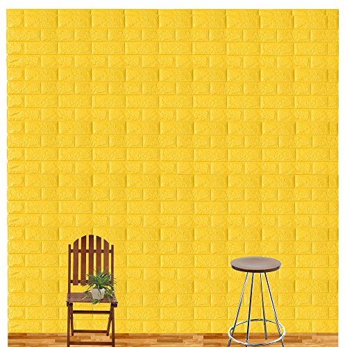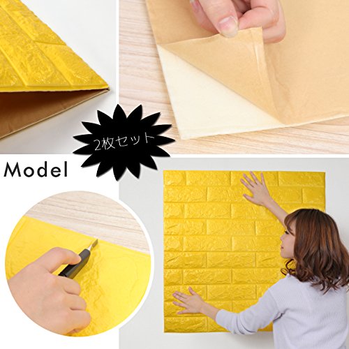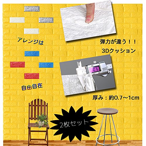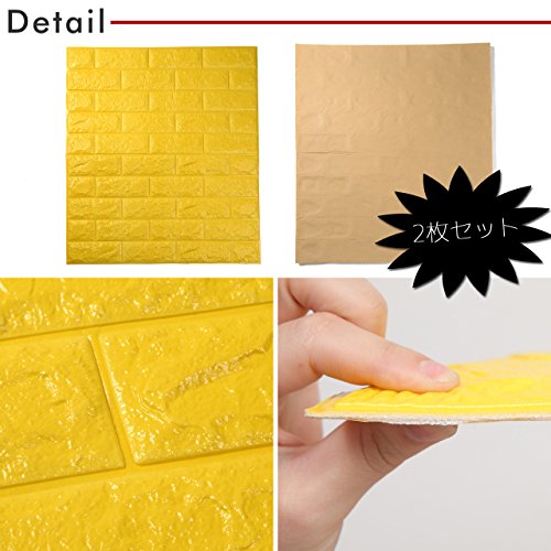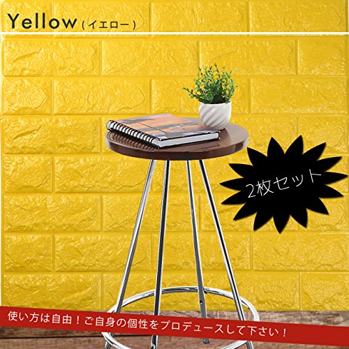 PlumRiver 【3Dで柔らかい弾力壁紙】70cm×77cm※クッション壁紙2枚セット※ DIY 防水 ブリックステッカー 壁紙 貼ってはがせる 壁紙シール ブリック壁紙 レンガシール レンガ調 タイル アンティーク インテリア クロス ブリックタイル 【イエロー】