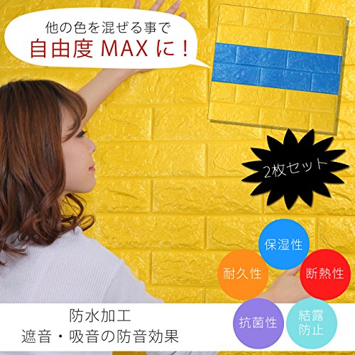 3Dで柔らかい弾力の壁紙です。カラー:【イエロー】枚数:【1枚】サイズ:【70cm×77cm】厚さ:【0.7~1cm】 レンガ調デザイン(レンガ風・レンガ柄・レンガタイプ)の弾力がある素材の為、若干の防音効果があります。壁のキズ隠しや汚れ隠しはもちろん、インテリアにも最適。猫の爪痕などもバッチリ隠せます。 高密度ポリエチレンフォームを採用しているので、保湿性・断熱性・耐久性・抗菌性に優れ、変色や変形しにくいです。結露防止にも効果があり、遮音・吸音の効果も優れています。また、表面は防水加工をしているので、キッチンやお風呂でも施工OKです。 クッションタイプのブリック壁紙、シールタイプだから施工も簡単です。ハサミやカッターで好きな大きさにカットして貼るだけなので専門知識は不要です。 とてもオシャレでかわいいお部屋にしてくれる必須のアイテムです。子供部屋など危険がある生活空間では、クッションガードとして効果絶大です。子供部屋、リビング、ダイニング、キッチン、トイレ、風呂、幼稚園、保育園、託児所、カラーボックスなどなど色々な場所やパーツで大活躍してくれる事間違いなしです。※商標権取得済み※