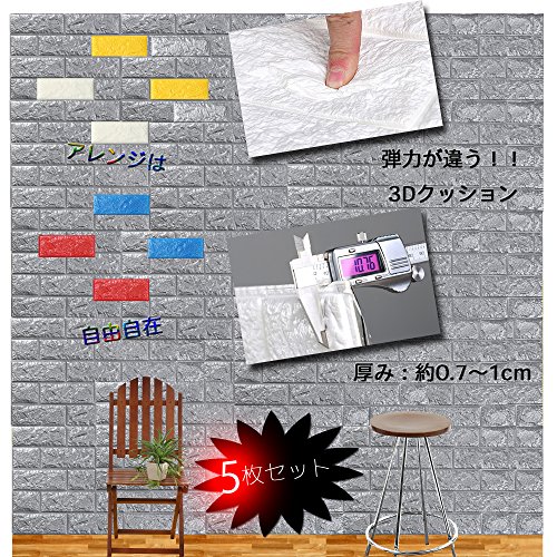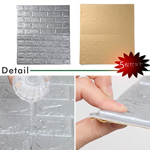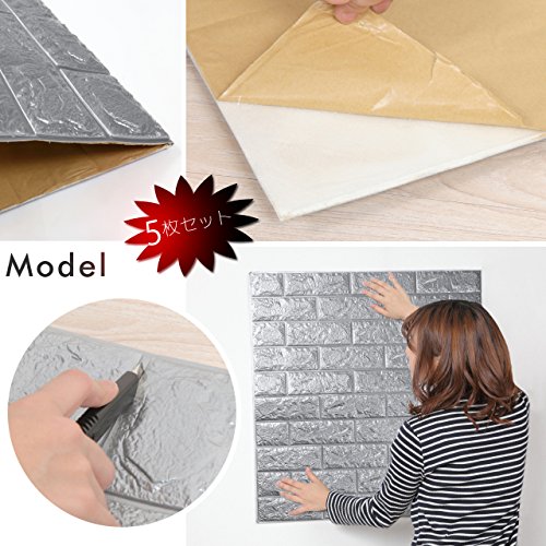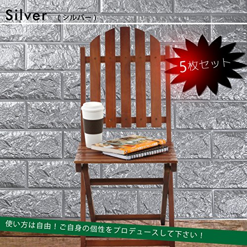 PlumRiver 【3Dで柔らかい弾力壁紙】70cm×77cm※クッション壁紙5枚セット※ DIY ブリックステッカー 壁紙 貼ってはがせる 壁紙シール ブリック壁紙 レンガシール レンガ調 タイル アンティーク インテリア クロス ブリックタイル 【シルバー】