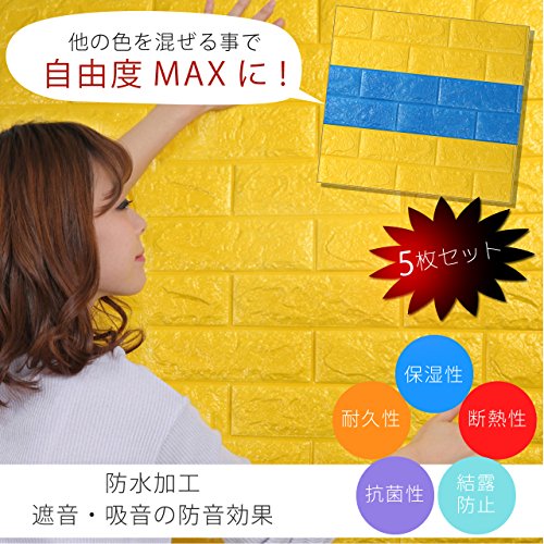 3Dで柔らかい弾力の壁紙です。カラー:【イエロー】枚数:【5枚】サイズ:【70cm×77cm】厚さ:【0.7~1cm】 レンガ調デザイン(レンガ風・レンガ柄・レンガタイプ)の弾力がある素材の為、若干の防音効果があります。壁のキズ隠しや汚れ隠しはもちろん、インテリアにも最適。猫の爪痕などもバッチリ隠せます。 高密度ポリエチレンフォームを採用しているので、保湿性・断熱性・耐久性・抗菌性に優れ、変色や変形しにくいです。結露防止にも効果があり、遮音・吸音の効果も優れています。また、表面は防水加工をしているので、キッチンやお風呂でも施工OKです。 クッションタイプのブリック壁紙、シールタイプだから施工も簡単です。ハサミやカッターで好きな大きさにカットして貼るだけなので専門知識は不要です。 とてもオシャレでかわいいお部屋にしてくれる必須のアイテムです。子供部屋など危険がある生活空間では、クッションガードとして効果絶大です。子供部屋、リビング、ダイニング、キッチン、トイレ、風呂、幼稚園、保育園、託児所、カラーボックスなどなど色々な場所やパーツで大活躍してくれる事間違いなしです。※商標権取得済み※