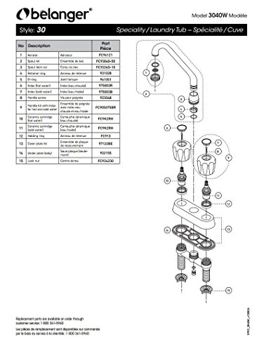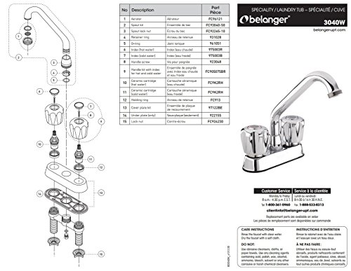 Belanger's specialty/laundry tub faucet kit includes one faucet, two 20-inch flexible stainless steel braided connectors, one 1-1/2-inch p-trap and one 1-1/2-inch by 12-inch extension tube. Its brass body and polished chrome finish give it a sleek look and features include a 4-inch c/c installation and a 6-inch swivel spout.