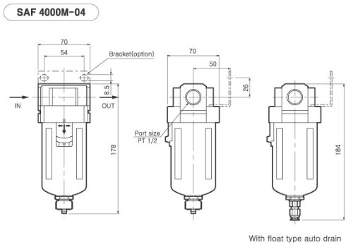 10 Micron Element Standard, 210 SCFM;Manual Drain & Polycarbonate Bowl with Metal Guard;1/2 NPT Female Thread;Bracket Included;Manufactured in Korea
