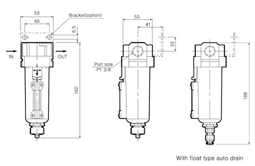 10 Micron element standard;Auto drain and metal bowl;3/8 National pipe thread taper Female thread;Bracket included
