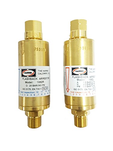 Electric flashback arrestors, it is designed to help prevent accidents caused by reverse gas flow or flashbacks built-in check valve protects against reverse flow brass construction for long life 100% tested for reliability and performance color coded by gas service for easy identification. capacity: welding: 3/8" cutting: 12" maximum inlet pressure: acetylene: 15 psig other fuel gases: 22 psig oxygen: 145 psig, hose size: 9/16" - 18 std.