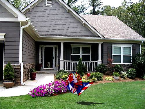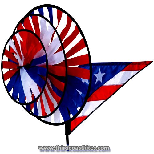 Patriotic Triple Spinner 33 x 27 in diameter: 17 in. Made with fade-resistant SolarMax fabric our garden spinners will dazzle your store and showroom. Unlike other ordinary spinners made with nylon or polyester ours can withstand daily UV rays rain and snow. Each spinner comes with two heavy duty fiberglass poles and a ground stake. Plant one of these in your garden or on your deck for an exciting color blast. Dimensions (H x W x L) : 20 x 21.5 x 21.5