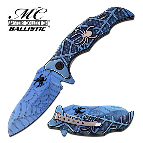 "スパイダー(インチ)ブルーチタンスプリングアシストナイフ。ブルーチタンコーティング3 - 1 / 2 "ステンレススチール刃3 mm厚酸エッチングされ、クモの巣ブラック3dスパイダー彫りのあるクモの巣と蜘蛛のハンドルにあるLanyard穴とポケットクリップ