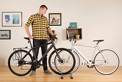 floor-rest bike stand;store 1 or 2 bikes in opposite directions;adjustable to securely hold any wheel up to 5 wide;rubberized feet protect floors;dimensions approximate: 26 x 11 x 15
