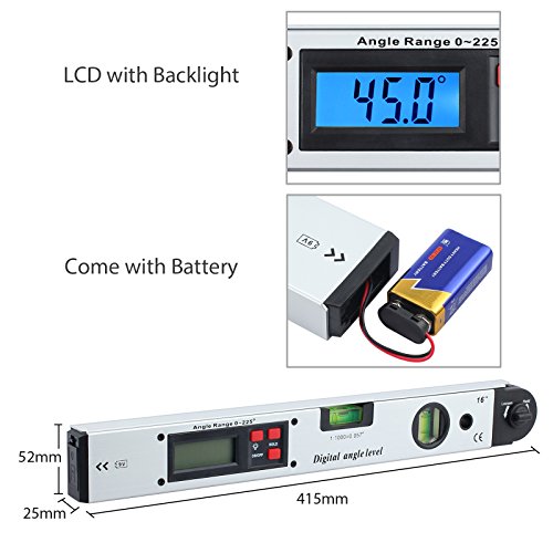 Proster デジタル水平計 0〜225°LCD 角度計 400mm 16inch 説明: 本製品はデジタル式の水平計です。主に、木工の線形化、トレイ、傾斜屋根および手すりなどの精確な角度の測定に適用します。また、水平および垂直の角度の測定もできます。