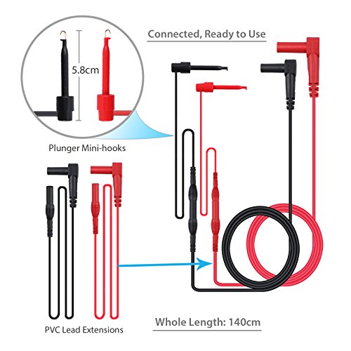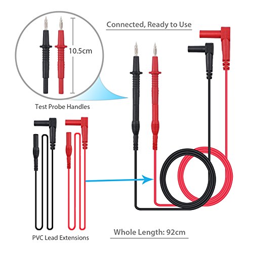 2)2本のモジュラー(1赤+1黒)102mmのヘビーデューティテストプローブ、4mmのバナナプラグチップ付き、長さ:10.5cm