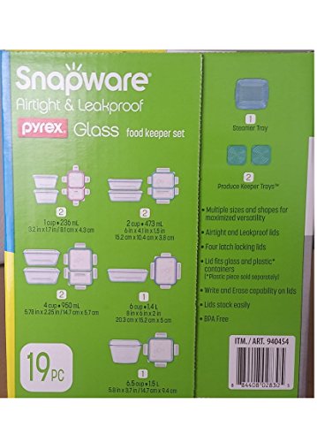 Cook, serve and store food using this 19-Piece Glass Food Storage Set with Easy Snap Lids;Snapware Glass food keeper: 19 pieces set (8 Containers + 8 Lids + 1 Steamer Tray + 2 Produce Keeper Trays);two - 1 cup container and lid; two - 2 cup container and lid; two - 4 cup container and lid; one - 6 cup container and lid; one - 6.5 cup container and lid; one Steamer Tray; two Produce Keeper Trays;100% Airtight and Leakproof; Dishwasher, microwave, and freezer safe;N Erase lid; Won't absorb odors or stains; made with Pyrex Glass; BPA Free; Made in USA; Write