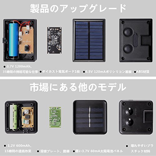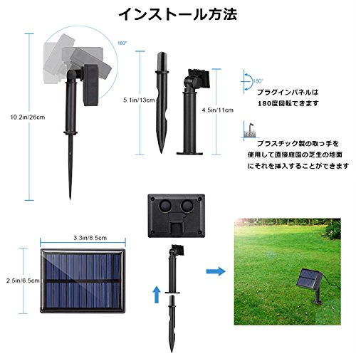 長い点灯時間:内蔵充電式の120mhA電池、4-6時間でフル充電した後、24-35時間まで続く点灯可能。 太陽エネルギーを電気に変換することによって、安全、省電力と環境に優しいです。