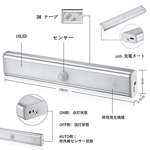 USB充電式10個の超高輝度LED、明るさが十分です。再充電が可能な省エネセンサーライトです。省エネルギーで自動性が高いラ 人感センサー