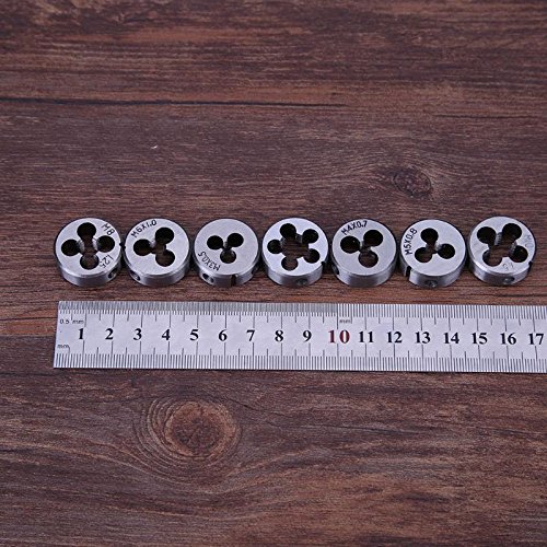 - 7ピースメトリックダイ: m3 × 0.5、m4 × 0.7、m5 × 0.8、m6 × 1.0、m8 × 1.25、m10 × 1.5、m12 × 1.75