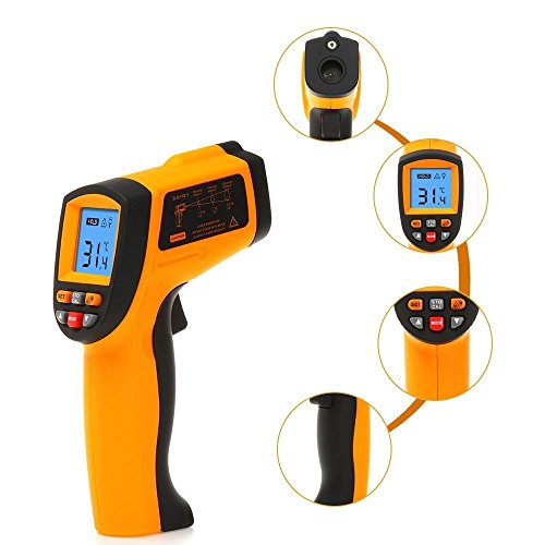 - 赤外線温度計はバックライト付きの見やすいLCDです。デジタル液晶ディスプレイは、暗いところでも読み取ります