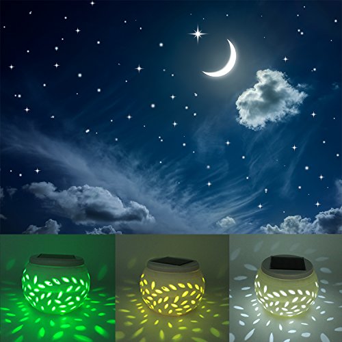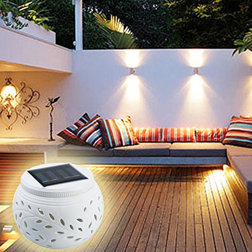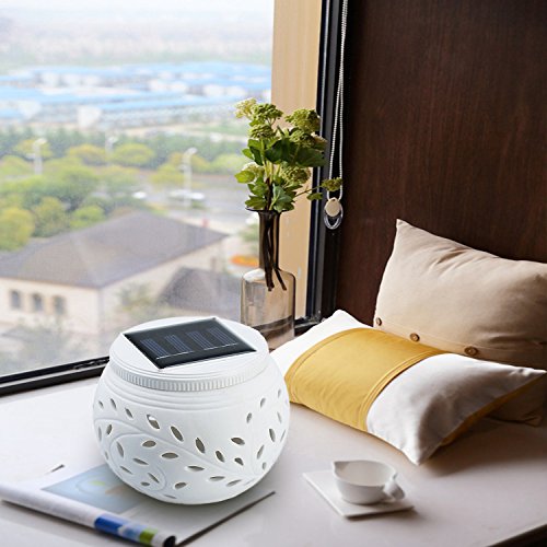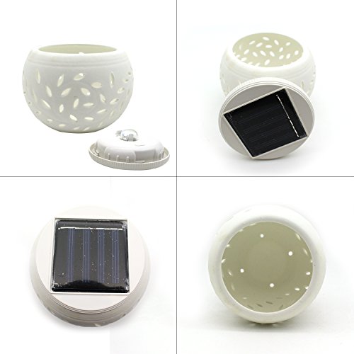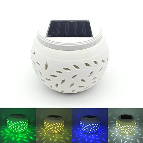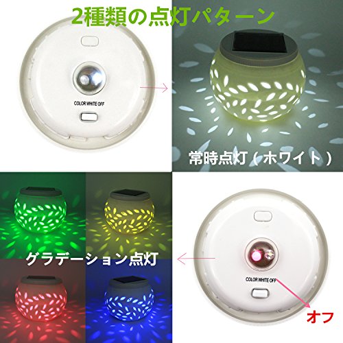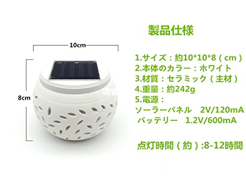 <製品仕様> 1. サイズ:約11*11*8(cm) 2. 本体のカラー:ホワイト 3. 材質:セラミック(主材) 4. 重量:約242g 5. スイッチモード:グラデーション点灯 (赤、緑、青)-常時点灯(ホワイト)-オフ 6. 電源:ソーラーパネル 2V/120mA バッテリー 1.2V/600mA
