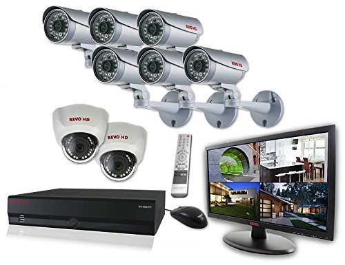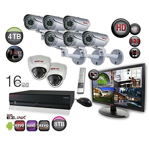 FEATURES ? REVOs professional 16-channel high definition surveillance system is perfect for small to large homes and businesses. ? Unlike other HD systems, REVOs new HD system is very user friendly. ? The HD NVR supports plug and play functionality and has some intelligent features including EZLINK, Push notifications, to most smartphones, email notification with attached video clip or jpeg image, and video blind. ? The 2 Megapixel cameras, provide super crisp and clear video images while the ultra-bright 23 in. widescreen LED monitor, provides a vivid display. ? The six bullet style die cast metal cameras included in this system are weather resistant (IP66 rated) and come equipped with a mounting bracket. ? The two indoor domes and the bullet cameras can see up to 120 FT in total darkness. 100 ft. of CAT5e cable is included with each camera. ? You will never have to worry about how to get power to your cameras with this system because it has a built-in 8 CH POE(Power Over Ethernet) switch. ? This expandable HD system has REVO EZLINK to automatically network your NVR on most routers. ? In Fact, REVOs advanced PENTAPLEXTM technology maximizes the DVR by allowing you to view live video/record/search/playback/back up and access the NVR Remotely, ALL AT THE SAME TIME! ? The massive 4TB Hard Disk Drive (system is upgradeable to an 8TB HDD as well) allows for months video storage capacity, depending on your settings. Advanced. Intelligent. Video Surveillance. REVO!. ? Length: 24. Height: 12. Width: 24 Inches