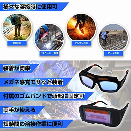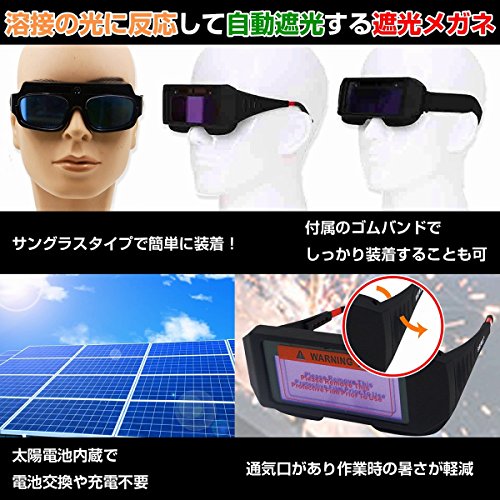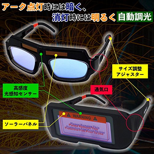 - ■溶接の光に反応して自動遮光する遮光メガネです!高感度光感知センサーでアーク点灯時には暗く、消灯時には明るくなるよう自動調光します!ソーラーパネル付きで太陽電池内蔵なので電池交換や充電不要です。通気口があり作業時の暑さを軽減できます。