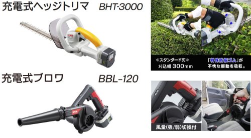充電ヘッジトリマ(BHT-3000)と充電ブロア(BBL-120 本体のみ)のセット 充電式ヘッジトリマ BHT-3000 「スタンダード刃」 ●電源を確保できない場所でも作業が行える充電式 ●不快な振動を吸収する「超低振動」モデル ●スタンダード刃付 ●刃物位置調節機能付 充電式ブロワ BBL-120 ●電源を確保できない場所でも作業が行える充電式 ●取り回し良好なコンパクトボディ ●風量の強弱を簡単に切換えできるスイッチ付 ●刃物位置調節機能付 ●移動時に便利なベルトフック付 ※電池パック/充電器は別販売品です。適用電池:当社ニカド12V電池パック