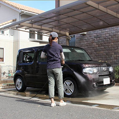 高圧洗浄機は、水道水から吸水した水に圧力をかけ、高水圧で噴射し、こびりついた頑固な汚れを洗浄します。