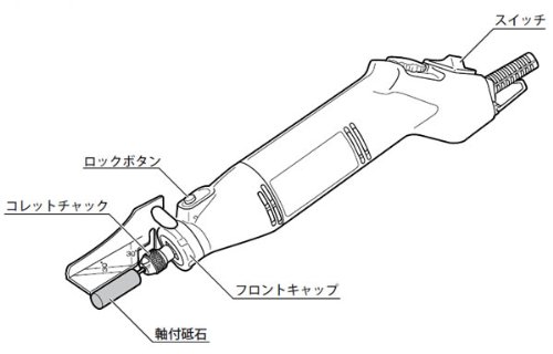 ●付属品: 片口スパナ、フロントキャップ、フロントキャップ(ガイド付=本体取付)、軸付砥石(径4mm、8mm各1ヶ)