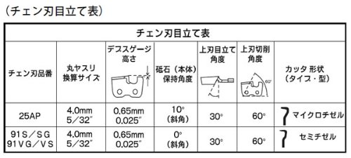●研磨可能ソーチェーンタイプ: オレゴンの25AP/90SG/91S/91VX/91SG/91VG