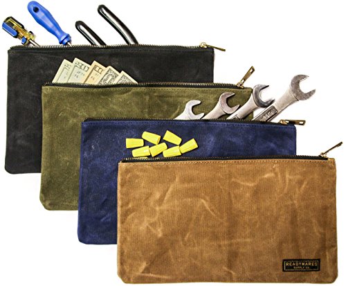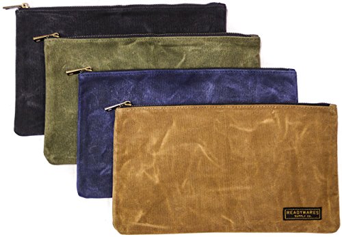 100% SATISFACTION GUARANTEE : We stand behind our product and want you to love it. If it doesn't work out for you, just send it back and we will refund your purchase, hassle-free.. The Zipper Bags by Readywares are constructed using a high quality 20oz waxed canvas that provides added protection against liquids, while giving the bags a timeless look. A durable and high quality brass zipper is used, which zips very smooth. The waxed canvas may feel a bit stiff upon first use, but it will loosen as the bags are used. Four bags are included, each a different color to provide easy tool organization. Bags measure 12.5" x 7". Cleaning & Care: Spot cleaning with a damp rag will suffice for most uses. If heavier cleaning is needed, you can clean with a brush using a mixture of castile soap and water. Do not machine wash or use detergent, as it will break down the wax in the fabric.