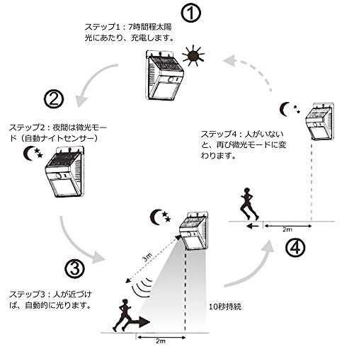 - センサーはPIR(受動型赤外線)を採用しており、動体が感知するとLEDライトが全点灯します。センサーの作動域は、距離が約3m程で、角度は120°となっております。