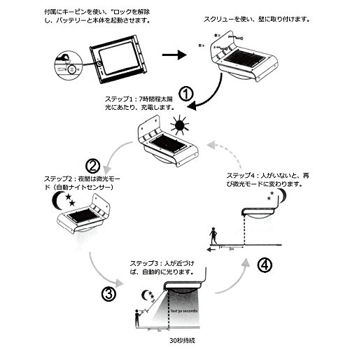 - 人感センサー:約3~5メートル離れた場所から動きが感知されます(120°の視野)。夜間に人の動きを感知されると、ライトモードは自動的に微光モードから強光モードに転換します。夜間自動点燈。