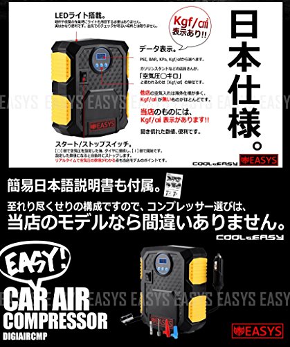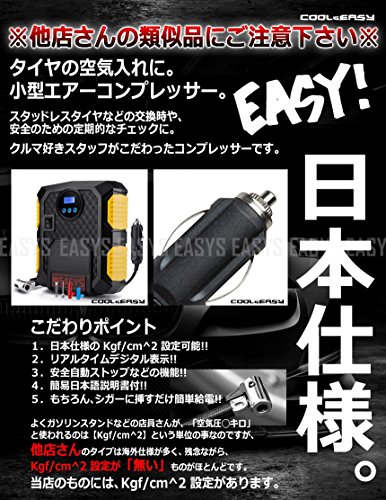 クルマ好きスタッフが、 こだわった電動コンプレッサーです。 こだわりポイント 1.日本仕様の Kgf/cm^2 設定可能!! 2.デジタル表示&安全自動ストップなどの機能!! 3.簡易日本語説明書付!! ガソリンスタンドなどの店員さんが、「空気圧◯キロ」 と使われるのは【Kgf/cm^2】の単位です。 他店さんのものは Kgf/cm^2 設定が「無い」ものがほとんどです。 当店のものには、Kgf/cm^2 設定があります。 聞き慣れた数値、便利です。 設定した数値に到達すると、 自動的にストップする機能も搭載。 簡易日本語説明書も付属。 至れり尽くせりの構成ですので、 コンプレッサー選びは当店のモデルで間違いありません。 ★最大空気圧10Kgf/cm^2 (普通のお車で2.0~4.5Kgf/cm^2ですので十分なパワーです) ★約3mのコードで取り回し楽々。 ★バックライト付デジタルメーターでリアルタイムチェック。 ★数種のノズル付き。浮き輪やゴムボートなど、 レジャー用品やおもちゃなどの空気入れも可能です。 ※輸入商品のため小傷や汚れ等ある場合がございます。 ※ご閲覧の液晶環境により色味が異なって見える場合がございます。 ※仕様は改善の為に予告なく変更する場合があります。