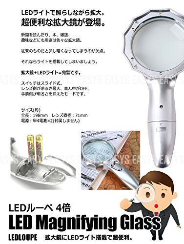 LEDライトで照らしながら拡大。 超便利な拡大鏡が登場。 新聞を読んだり、本、雑誌、 趣味などにも用途は色々な拡大鏡。 従来のものだと少し暗くなってしまうのが欠点。 それならライトを搭載してしまいましょう。 拡大鏡+LEDライト=完璧です。 スイッチはスライド式。 レンズ側が明るさ最大、真ん中がOFF、 手前側が明るさを抑えたモードです。 サイズ(約) 全長:198mm レンズ直径:71mm 電源:単4電池×2 (付属しません) ※輸入商品のため小傷や汚れ等ある場合がございます。 ※ご閲覧の液晶環境により色味が異なって見える場合がございます。