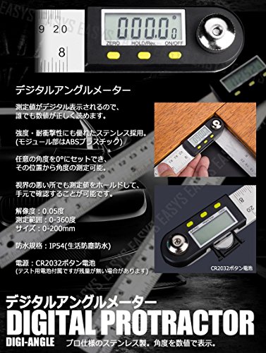 デジタルアングルメーター 測定値がデジタル表示されるので、 誰でも数値が正しく読めます。 強度・耐衝撃性にも優れたステンレス採用。 (モジュール部はABSプラスチック) 任意の角度を0°にセットでき、 その位置から角度の測定可能。 視界の悪い所でも測定値をホールドして、 手元で確認することが可能です。 解像度:0.05度 測定範囲:0-360度 サイズ:0-200mm 防水規格:IP54(生活防塵防水) 電源:CR2032ボタン電池 (テスト用電池付属ですが残量が無い場合があります) ※輸入商品のため小傷や汚れ等ある場合がございます。 ※ご閲覧の液晶環境により色味が異なって見える場合がございます。
