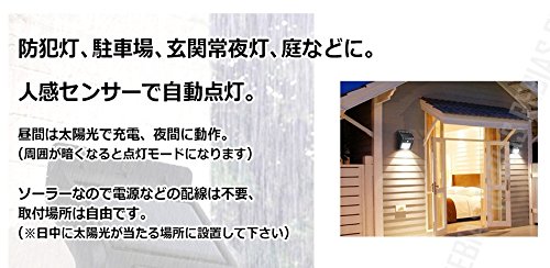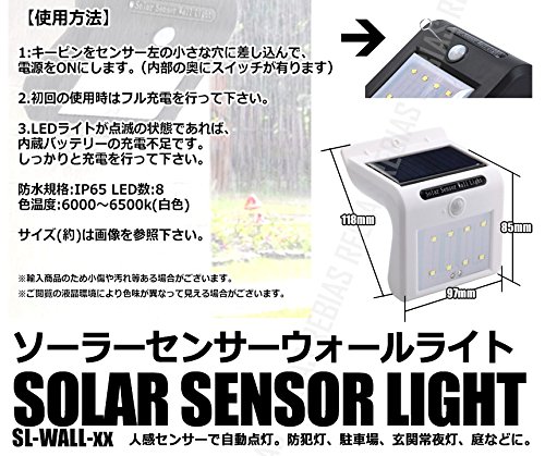 防犯灯、駐車場、玄関常夜灯、庭などに。 人感センサーで自動点灯。 昼間は太陽光で充電、夜間に動作。 (周囲が暗くなると点灯モードになります) ソーラーなので電源などの配線は不要、 取付場所は自由です。 (※日中に太陽光が当たる場所に設置して下さい。) 【使用方法】 1:付属のキーピンをセンサー左の小さな穴に差し込み、 電源をONにします。(内部の奥にスイッチが有ります) 2.初回の使用時はフル充電を行って下さい。 3.LEDライトが点滅の状態であれば、 内蔵バッテリーの充電不足です。 しっかりと充電を行って下さい。 防水規格:IP65 LED数:8 色温度:6000~6500k(白色) サイズ(約)は画像を参照下さい。 ※輸入商品のため小傷や汚れ等ある場合がございます。 ※ご閲覧の液晶環境により色味が異なって見える場合がございます。