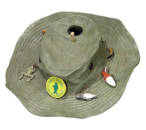 Trying to LURE some birds to roost in your back yard. What better way to reel them in than this birdhouse shaped like an old Fishing Hat. Quality construction made from painted resin. Measure approx. 11 by 4 by 11 inches. Fishing Hat bird house crafted of Cold-Cast porcelain and hand painted 14 inch diameter Clean out hole in the back and drain hole Includes hanger Truly functional bird house that looks so good it can also be used indoor