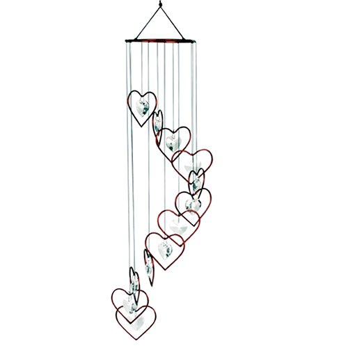 When love is in the air let it flow through this beautiful red heart chime set. A colored metal platform holds a circle of red wires from which are suspended a series of heart-shaped frames each holding a faux crystal that will sparkle and glow in the sun. A great gift for Valentines Day or as a present to the newly engaged or newlywed couple. 6 by 6 by 36 inches.