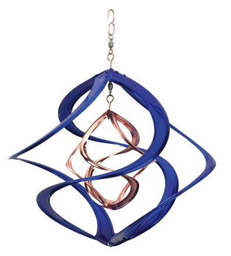 While away a summers afternoon in your hammock and enjoy the whirling of our blue wind spinner in a branch above you. The intriguing design cages one figure within another each in reverse directions yet whirling at the same time on the swivel at the top. A beautiful piece of metal sculpture at rest and an optical illusion when in motion. Copper-plated baked metal with a clear coat. 14 inches diameter. Handcrafted of copper plated metal Baked Metal Clear Coat Includes S hook swivel for easy hanging and smooth spinning Blue accents Red Carpet Studios custom design