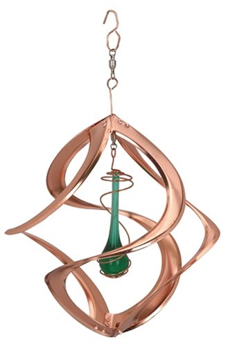 Put a unique spin on your outdoor decor. This beautiful quadruple helix spinner will add a little sparkle to your patio or garden. The glass teardrop accent captures the light brilliantly while the helix twirls gently in the slightest breeze. Made of copper plated metal. Green glass teardrop accent Measures approximately 11 inches H by 8 inches W. Features an S-hook for easy hanging and a swivel for smooth spinning. Easy care and cleaning instructions are included. Handcrafted of copper plated metal Baked Metal Clear Coat Includes S hook swivel for easy hanging and smooth spinning Green glass teardrop Red Carpet Studios custom design