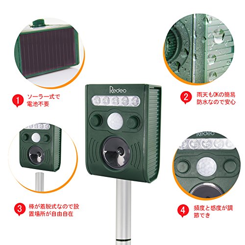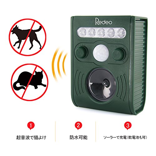 Redeo 猫よけ超音波 動物撃退器 害獣撃退 ソーラー式 フラッシュライト 防水 簡単設置