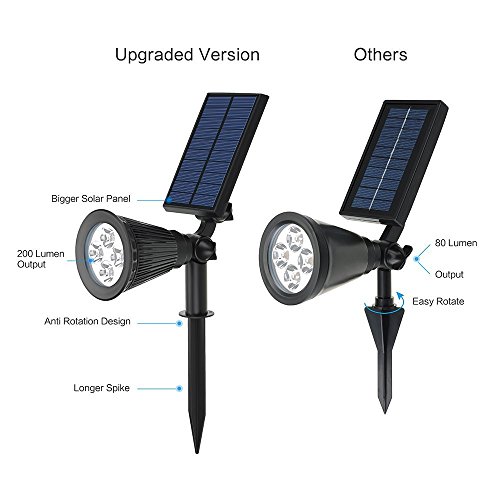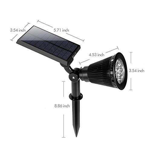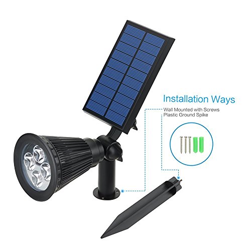 - 防水新型室外ソーラーライトです。このソーラースポットライトは、迅速かつ安全にインストールすることができます。耐久性のあるプラスチック構造と防水シールで、このソーラースポットライトは、どんな天候にも耐えることができます。家の周りの木々を照らすようなインストールのために最適です。