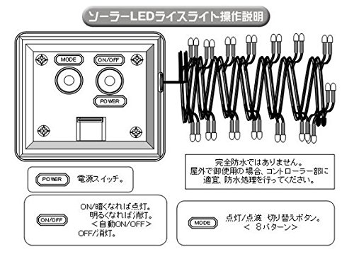 - MODEスイッチで常時点灯や、じわっとホタル、派手にフラッシュなど多彩!全8パターン:1.常時点灯 2.ランダム 3.半分ずつまたたく 4.交互点滅 5.交互点灯 6.交互に激しく点滅 7.ジワっと点滅 8.交互点滅